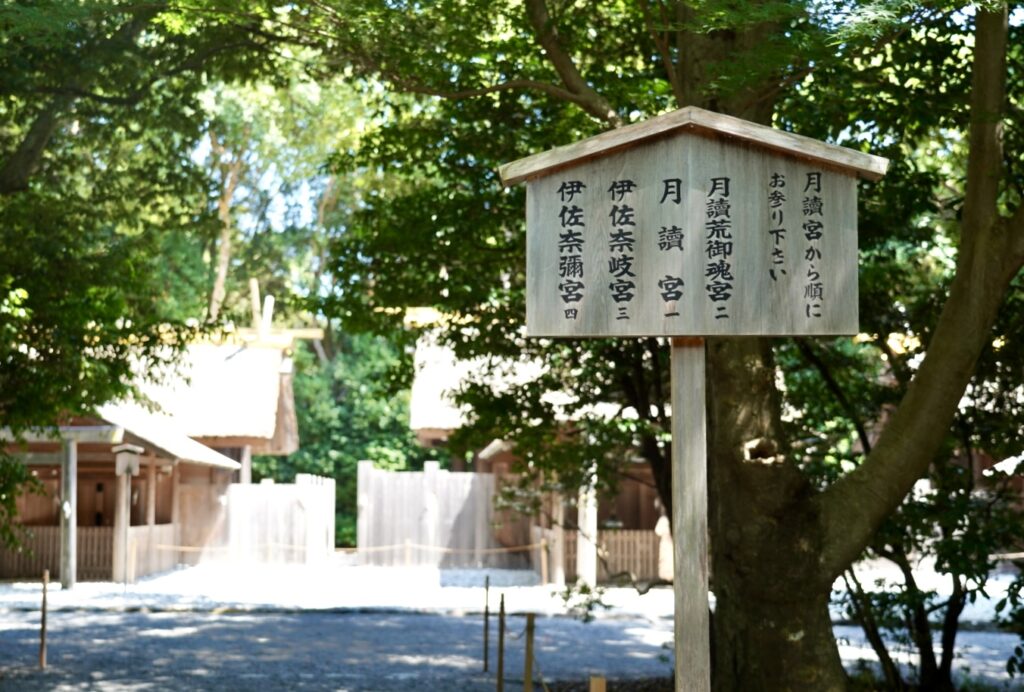 山道を奥まで進むと、四社が横に並んでいます。左から伊邪那美命いざなみのみこと伊邪那岐命いざなきのみこと、月読命、月読命(荒御魂あらみたま)が祀られています。参拝の順番は案内の看板がありますので、そちらに従います。